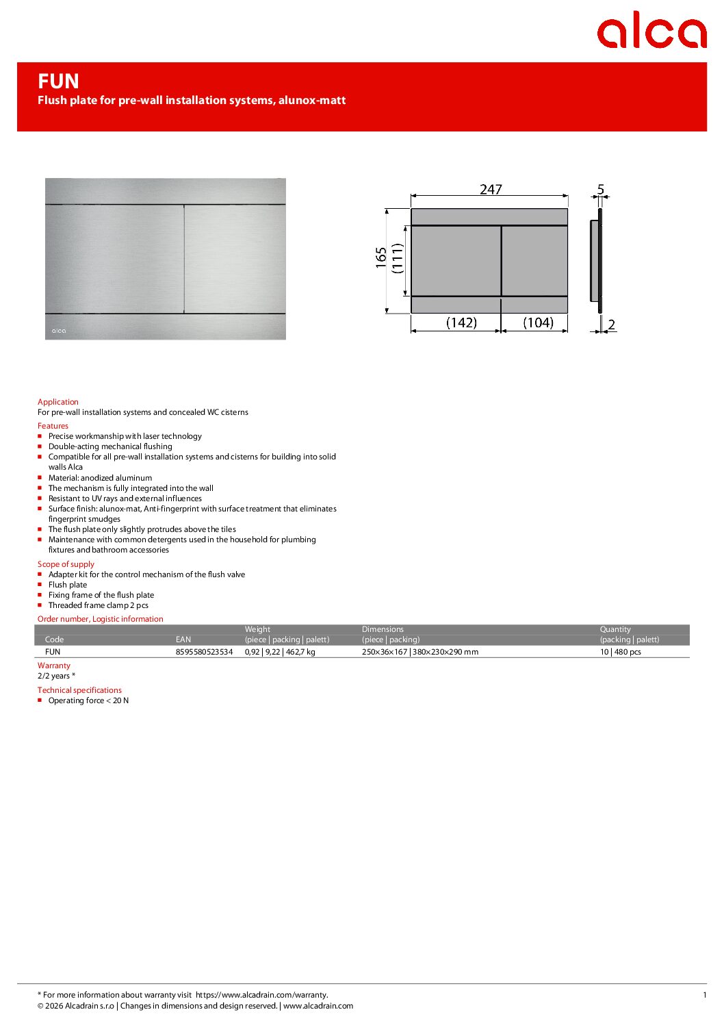 Alca plast vandens nuleidimo mygtukas Alcadrain FUN, aliuminis. Jie buvo sukurti reikliausiems klientams. Jie atitinka šiuolaikinės interjero architektūros reikalavimus – originalus dizainas sukuria švarią liniją su kitais vonios kambario elementais. Techninis sprendimas taip pat naujas. Mechanizmas yra visiškai integruotas į sieną, todėl mygtukai beveik neišsikiša virš plytelių. Jie pagaminti iš šlifuoto metalo, ant kurio nematyti pirštų atspaudų. FLAT mygtukai yra visiškai suderinami su visomis ALCA potinkinių modulių sistemomis.
