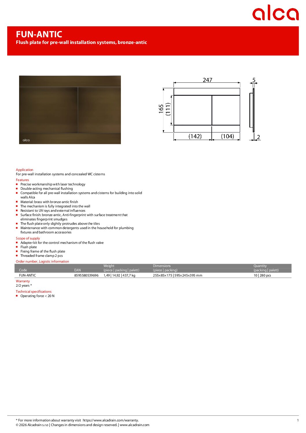 Alca plast vandens nuleidimo mygtukas Alcadrain FUN-ANTIC bronza-antikvarinė. Jie buvo sukurti reikliausiems klientams. Jie atitinka šiuolaikinės interjero architektūros reikalavimus – originalus dizainas sukuria švarią liniją su kitais vonios kambario elementais. Techninis sprendimas taip pat naujas. Mechanizmas yra visiškai integruotas į sieną, todėl mygtukai beveik neišsikiša virš plytelių. Jie pagaminti iš šlifuoto metalo, ant kurio nematyti pirštų atspaudų. FLAT mygtukai yra visiškai suderinami su visomis ALCA potinkinių modulių sistemomis.