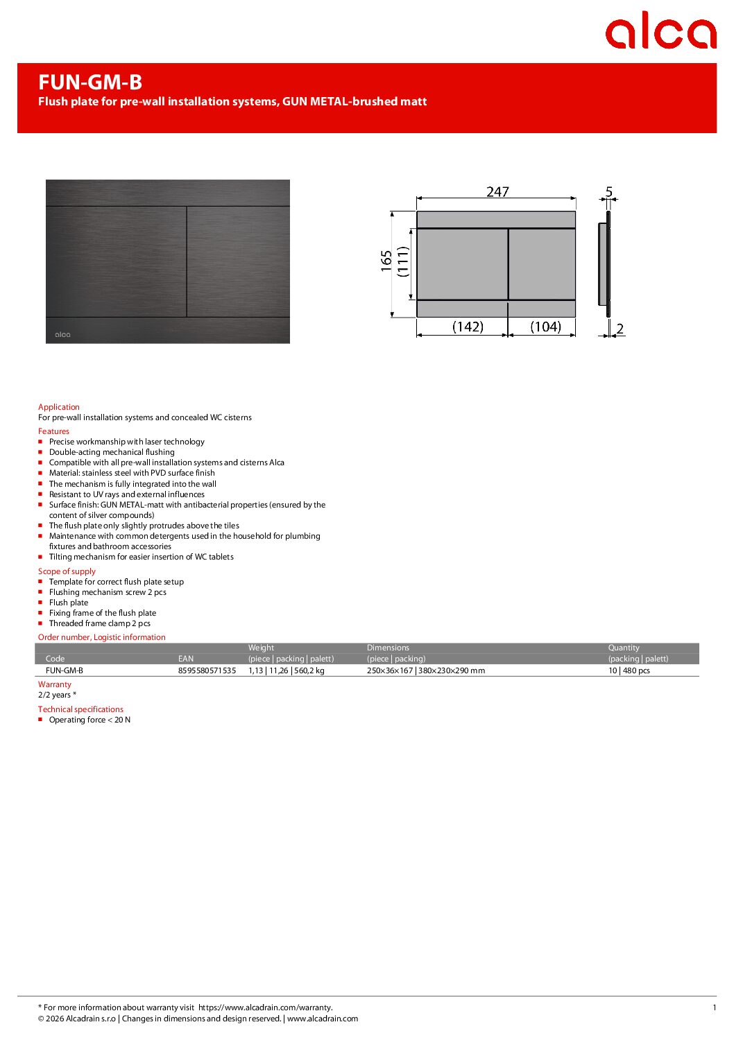 Alca plast vandens nuleidimo mygtukas Alcadrain FUN-GM-B, nerūdijantis plienas, tamsaus metalo spalvos. Jie buvo sukurti reikliausiems klientams. Jie atitinka šiuolaikinės interjero architektūros reikalavimus – originalus dizainas sukuria švarią liniją su kitais vonios kambario elementais. Techninis sprendimas taip pat naujas. Mechanizmas yra visiškai integruotas į sieną, todėl mygtukai beveik neišsikiša virš plytelių. Jie pagaminti iš šlifuoto metalo, ant kurio nematyti pirštų atspaudų. FLAT mygtukai yra visiškai suderinami su visomis ALCA potinkinių modulių sistemomis.