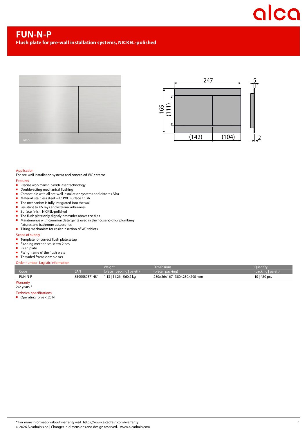 Alca plast vandens nuleidimo mygtukas Alcadrain FUN-N-B, FUN-N-P, nikelio poliravimo spalvos. Jie buvo sukurti reikliausiems klientams. Jie atitinka šiuolaikinės interjero architektūros reikalavimus – originalus dizainas sukuria švarią liniją su kitais vonios kambario elementais. Techninis sprendimas taip pat naujas. Mechanizmas yra visiškai integruotas į sieną, todėl mygtukai beveik neišsikiša virš plytelių. Jie pagaminti iš šlifuoto metalo, ant kurio nematyti pirštų atspaudų. FLAT mygtukai yra visiškai suderinami su visomis ALCA potinkinių modulių sistemomis.