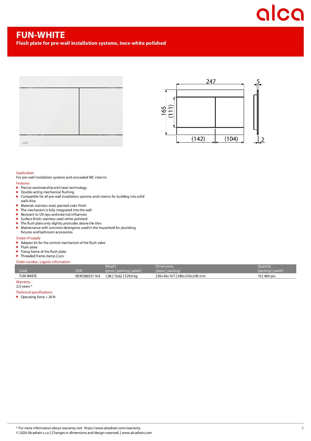 Alca plast vandens nuleidimo mygtukas Alcadrain FUN-WHITE, nerūdijantis plienas, baltas. Jie buvo sukurti reikliausiems klientams. Jie atitinka šiuolaikinės interjero architektūros reikalavimus – originalus dizainas sukuria švarią liniją su kitais vonios kambario elementais. Techninis sprendimas taip pat naujas. Mechanizmas yra visiškai integruotas į sieną, todėl mygtukai beveik neišsikiša virš plytelių. Jie pagaminti iš šlifuoto metalo, ant kurio nematyti pirštų atspaudų. FLAT mygtukai yra visiškai suderinami su visomis ALCA potinkinių modulių sistemomis.
