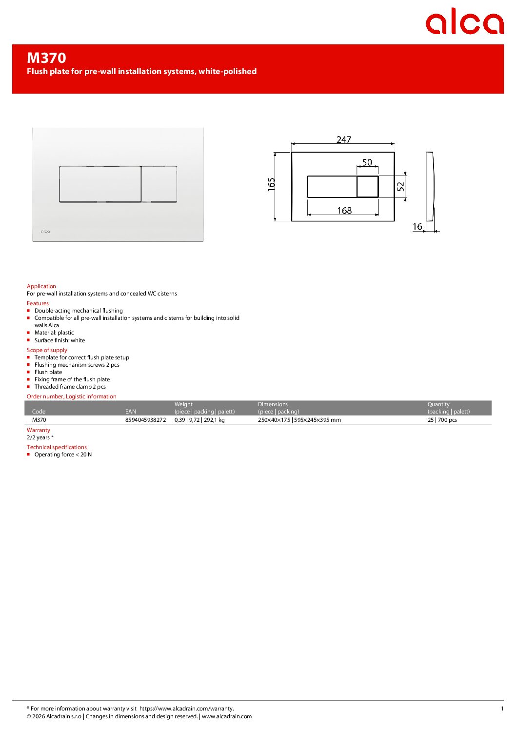 Alca plast vandens nuleidimo mygtukas Alcadrain M370, baltas plastikas. Skirtas priešsieninėms montavimo sistemoms ir potinkiniams WC bakams.