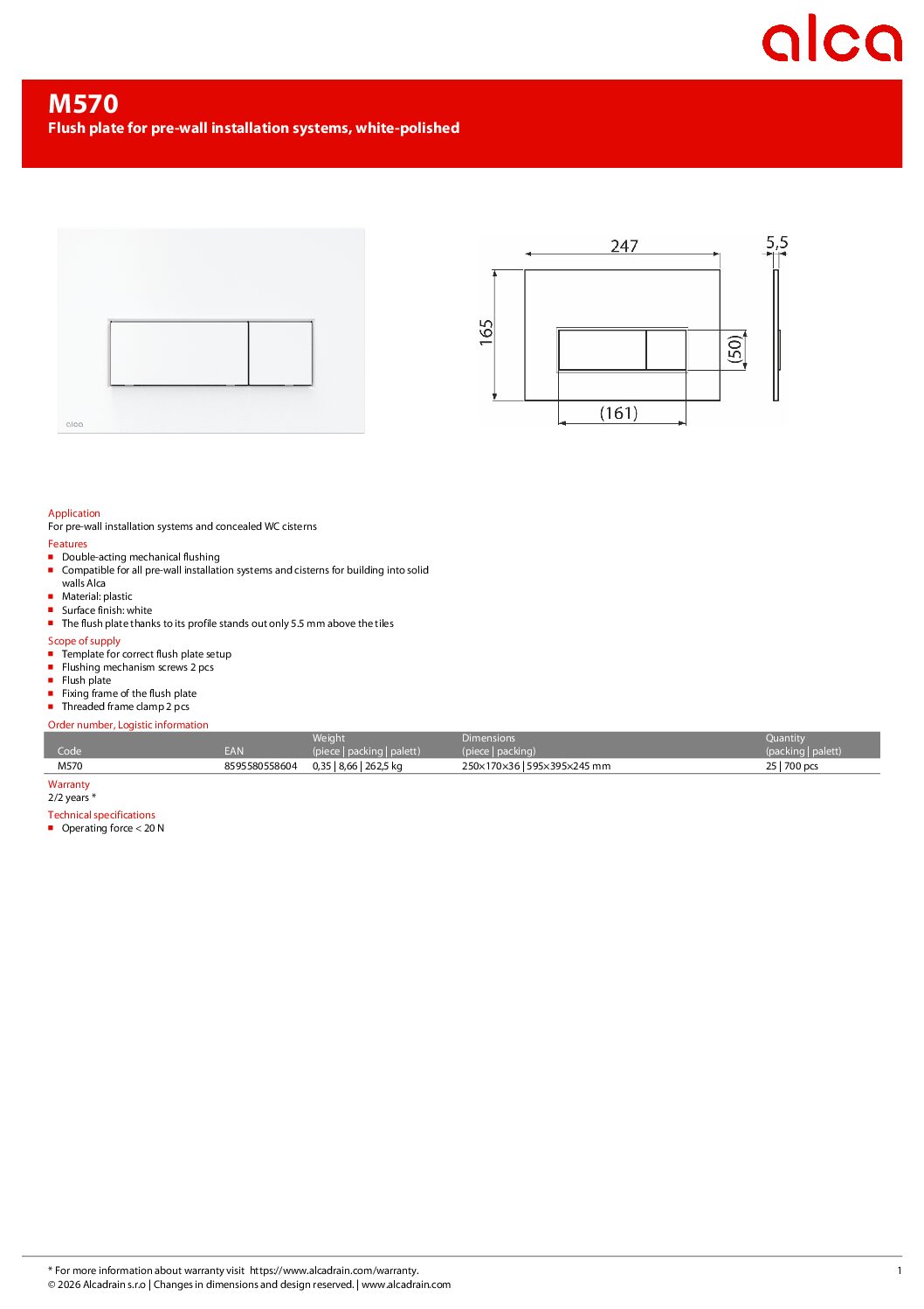 Alca plast vandens nuleidimo mygtukas Alcadrain M570, baltas plastikas. Skirtas priešsieninėms montavimo sistemoms ir potinkiniams WC bakams.