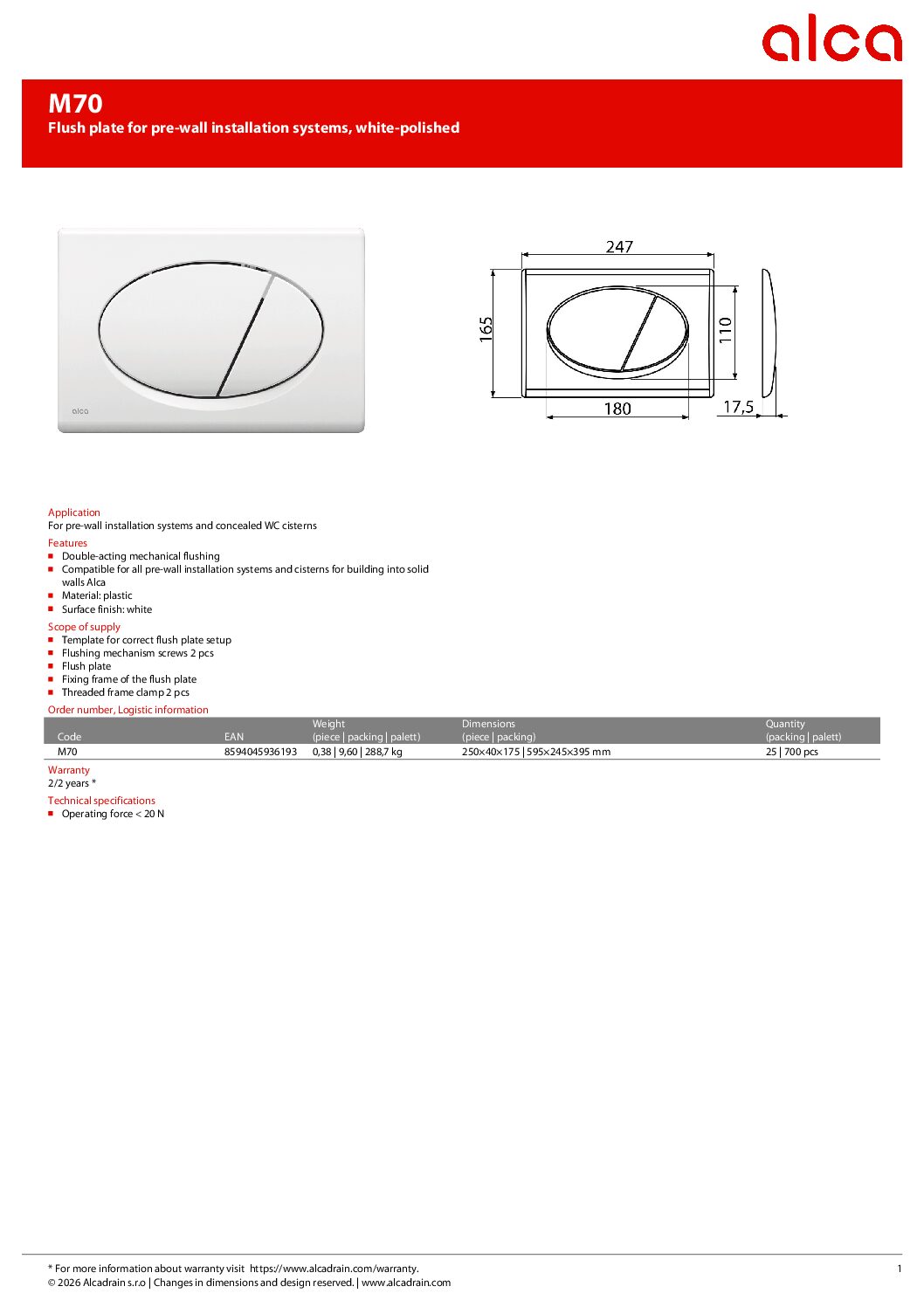 Alca plast vandens nuleidimo mygtukas Alcadrain M70, baltas plastikas. Skirtas priešsieninėms montavimo sistemoms ir potinkiniams WC bakams.