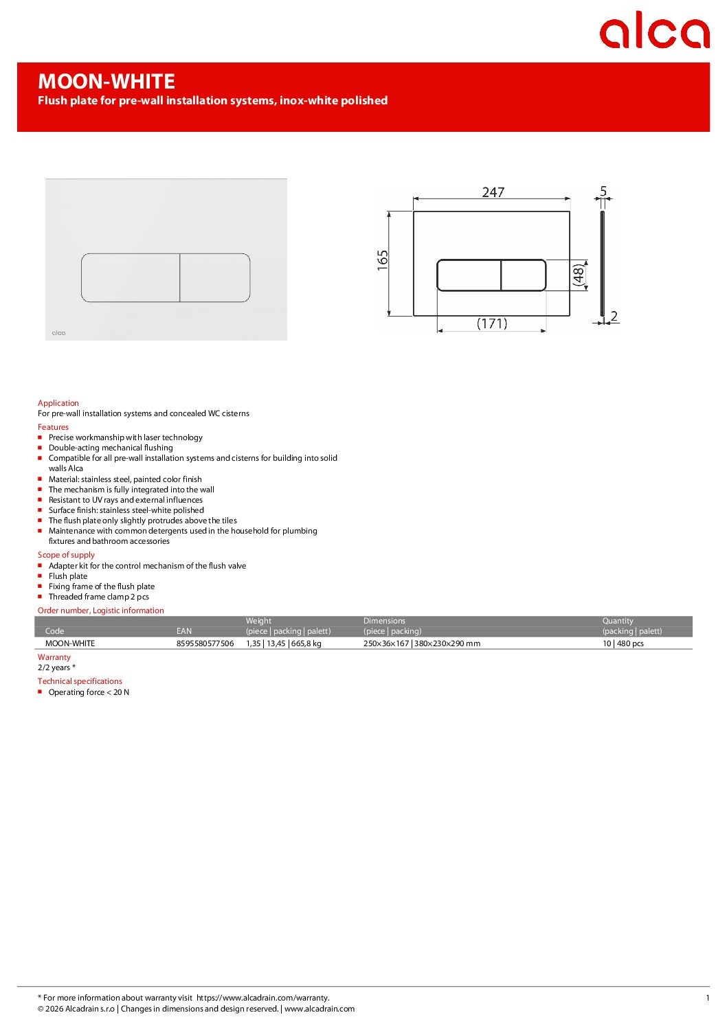 Alca plast vandens nuleidimo mygtukas Alcadrain MOON-WHITE, nerūdijantis plienas, baltos spalvos. Skirtas priešsieninėms montavimo sistemoms ir potinkiniams WC bakams.