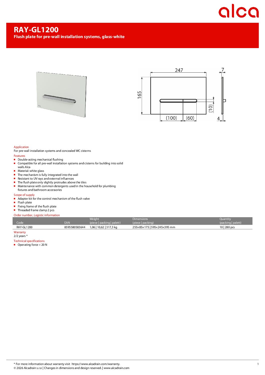 Alca plast vandens nuleidimo mygtukas Alcadrain RAY-GL1200, baltas stiklas. Skirtas priešsieninėms montavimo sistemoms ir potinkiniams WC bakams.