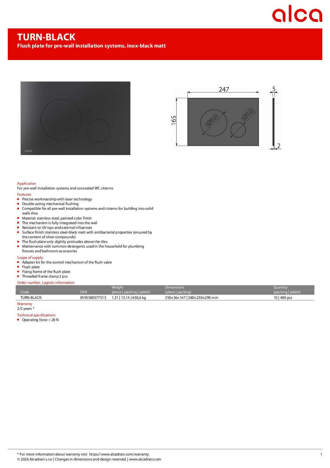 Alca plast vandens nuleidimo mygtukas Alcadrain TURN-BLACK, nerūdijantis plienas, matinis juodas. Jie buvo sukurti reikliausiems klientams. Jie atitinka šiuolaikinės interjero architektūros reikalavimus – originalus dizainas sukuria švarią liniją su kitais vonios kambario elementais.Techninis sprendimas taip pat naujas. Mechanizmas yra visiškai integruotas į sieną, todėl mygtukai beveik neišsikiša virš plytelių. Jie pagaminti iš šlifuoto metalo, ant kurio nematyti pirštų atspaudų.