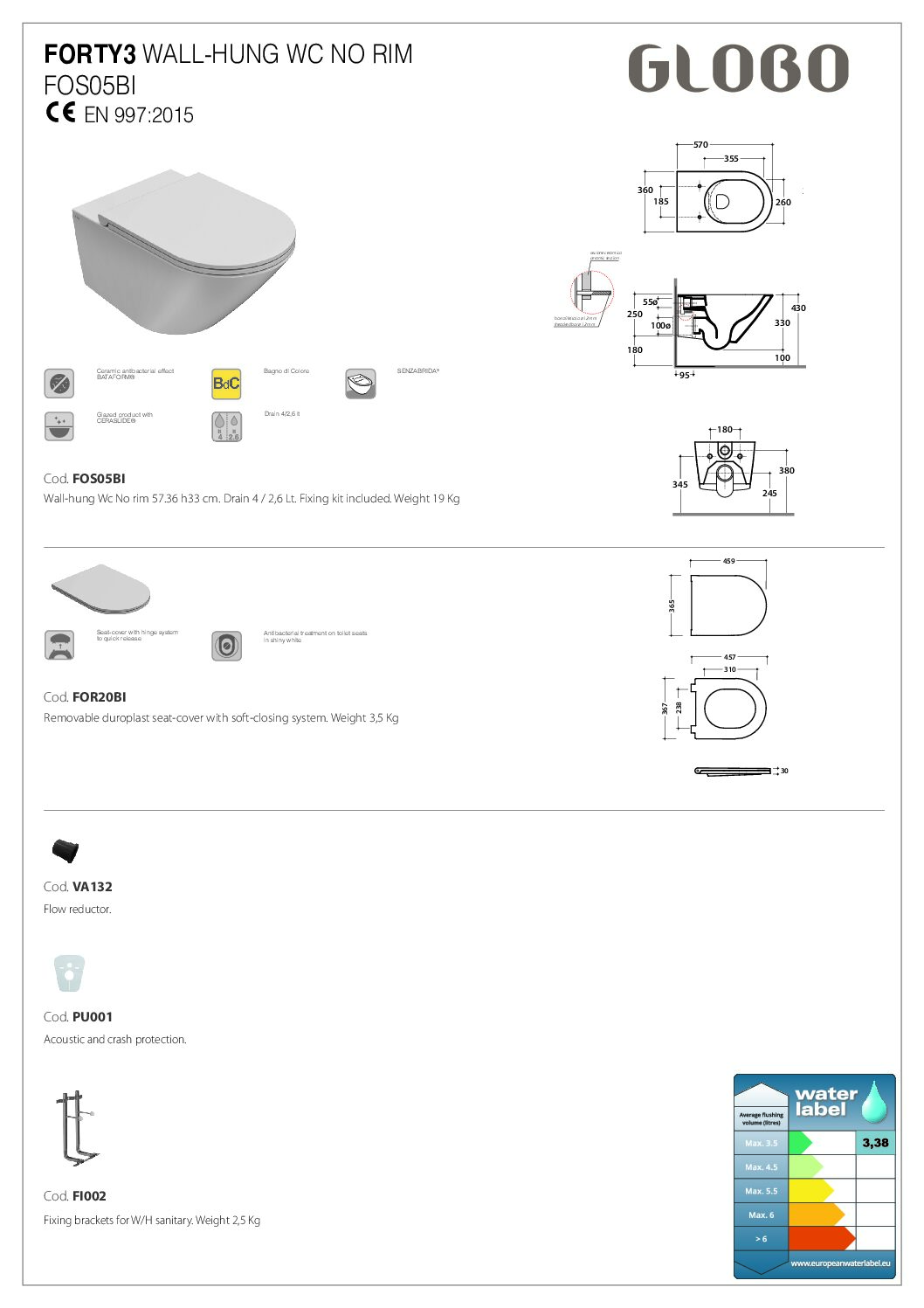 GLOBO Forty3 lėtai nusileidžiantis dangtis. Nuimamas duroplast sėdynės užvalkalas su minkšto uždarymo sistema. Skirta tualeto dubenims Globo Forty3 art. FOS05​.BI, FOS03.BI, FO001.BI, FO002.BI.