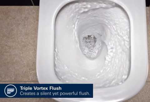 • Unikali GROHE Triple Vortex vandens nuleidimo technologija naudoja tris vandens išleidimo angas sukurdama tylų, galingą sūkurį, kuris pasiekia kiekviena unitazo kampą.