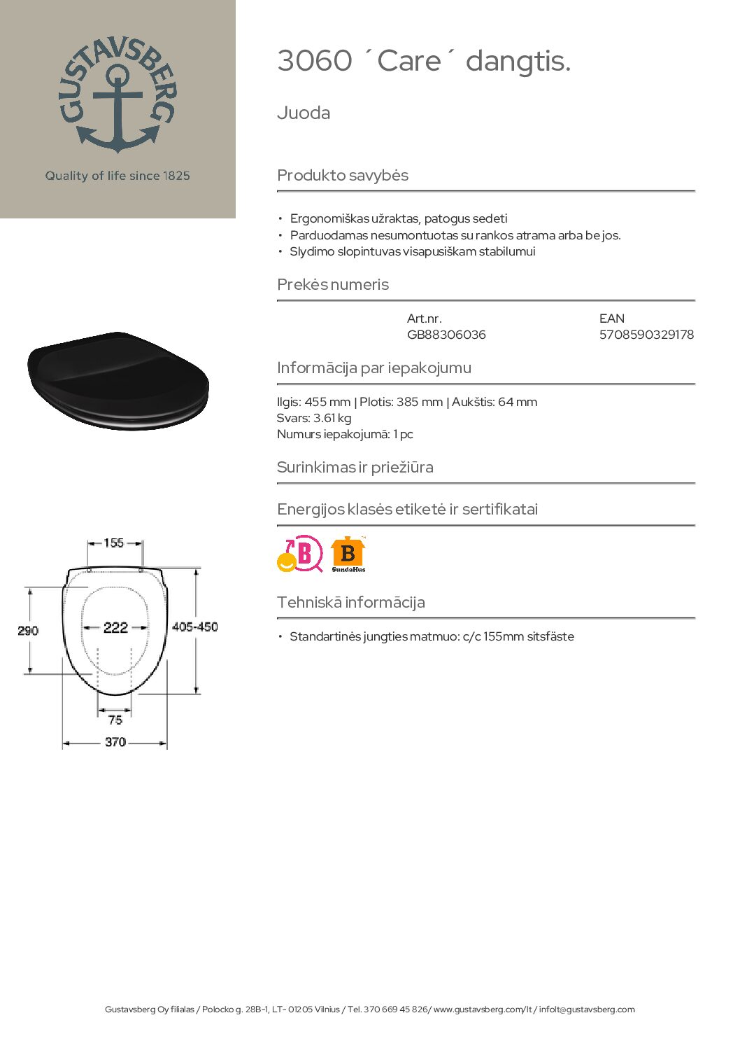 Gustavsberg 3060 Nautic Care dangtis. Juodos spalvos. Ergonomiškas užraktas, patogus sedeti. Parduodamas nesumontuotas su rankos atrama arba be jos. Slydimo slopintuvas visapusiškam stabilumui.