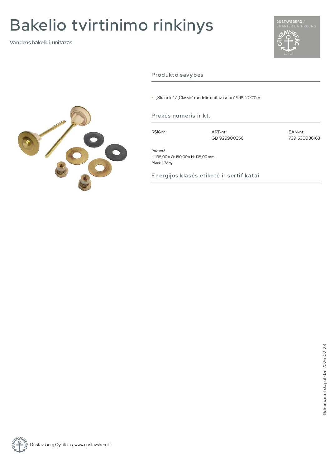 Gustavsberg Classic nuo 2001-2007 m. bakelio tvirtinimo rinkinys. Vandens bakeliui, unitazas. „Skandic“ / „Classic“ modelio unitazas nuo 1995-2007 m.