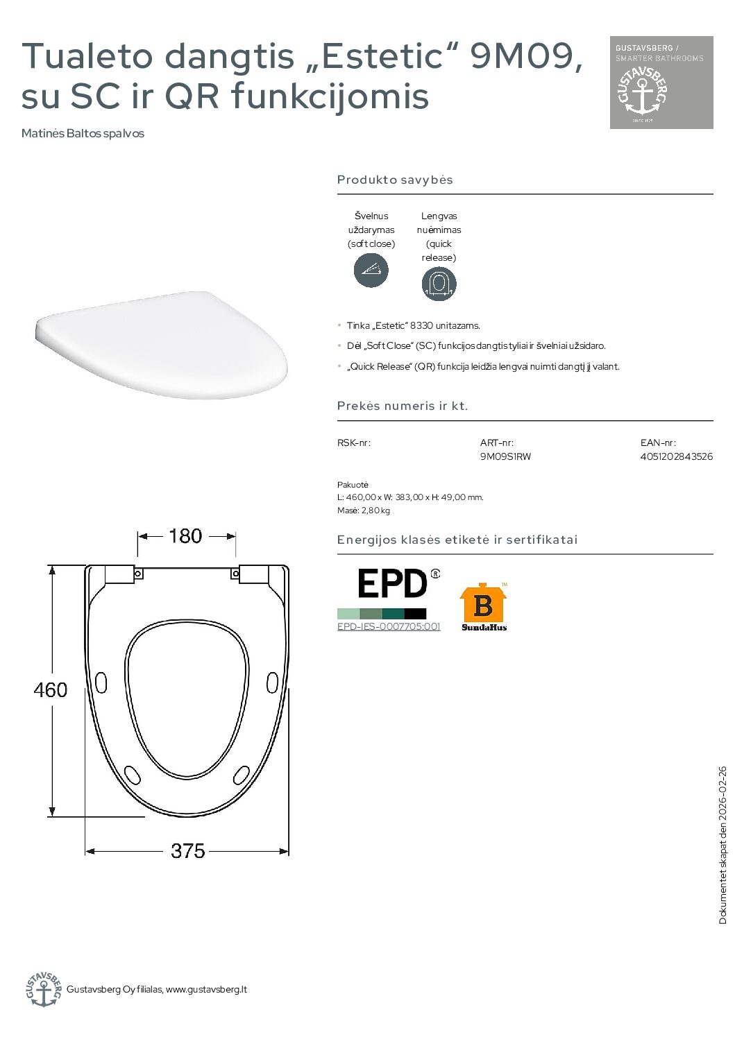 Gustavsberg Estetic 9M09 su SC ir QR funkcijomis dangtis, matinės baltos spalvos dangtis su tvirtais lankstais. Pagamintas iš aukštos kokybes kieto plastiko. Tinka „Estetic“ 8330. Dėl „Soft Close“ (SC) funkcijos dangtis uždaromas tyliai ir švelniai. Dėl „Quick Release“ (QR) funkcijos dangtis greitai nusiima, kad būtų lengviau valyti