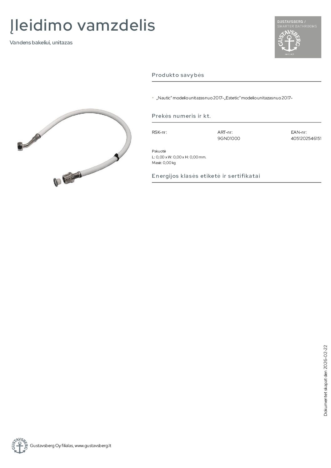 Gustavsberg Nautic 1522 HF, nuo 2017- Įleidimo vamzdelis. Vandens bakeliui, unitazas lanksti žarna su jungtimi. „Nautic“ modelio unitazas nuo 2017-„Estetic“ modelio unitazas nuo 2017-