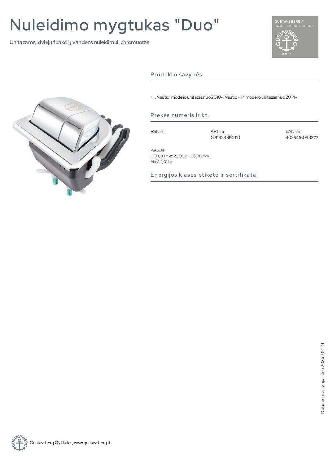 Gustavsberg Nautic“ 2010-2017 m. nuleidimo mygtukas „Duo” Unitazams, dviejų funkcijų vandens nuleidimui, chromuotas. „Nautic“ modelio unitazas nuo 2010-„Nautic HF“ modelio unitazas nuo 2014-