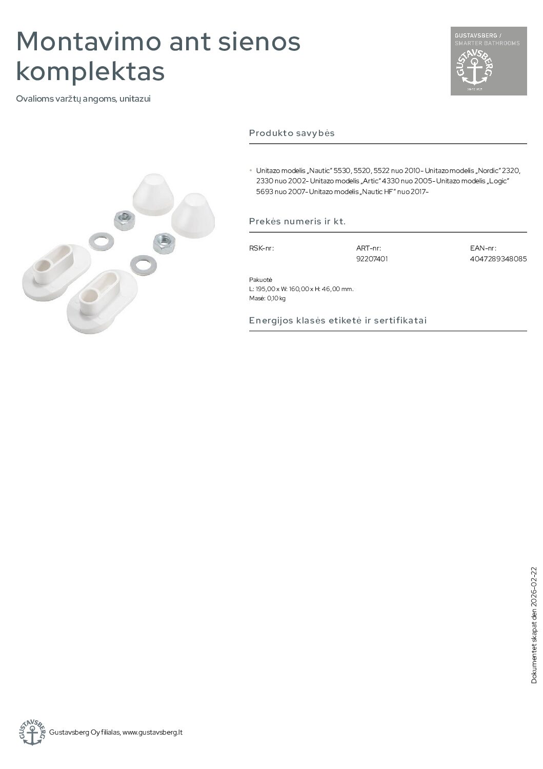 Gustavsberg Nautic 5530 nuo 2010- montavimo ant sienos komplektas. Ovalioms varžtų angoms, unitazui. Unitazo modelis „Nautic“ 5530, 5520, 5522 nuo 2010- Unitazo modelis „Nordic“ 2320, 2330 nuo 2002- Unitazo modelis „Artic“ 4330 nuo 2005- Unitazo modelis „Logic“ 5693 nuo 2007- Unitazo modelis „Nautic HF“ nuo 2017-