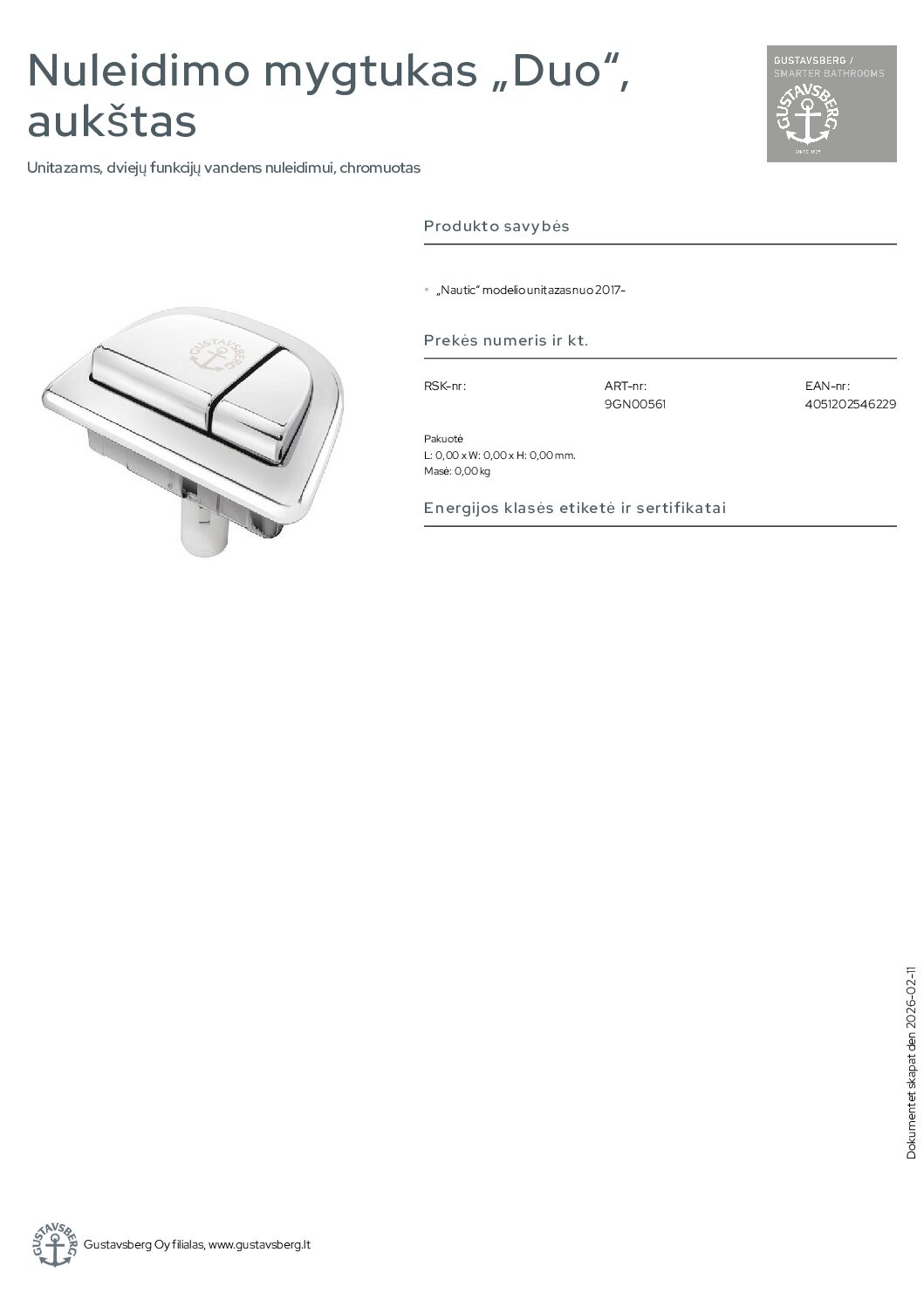 Gustavsberg nuleidimo mygtukas „Duo“, aukštas. Unitazams, dviejų funkcijų vandens nuleidimui, chromuotas. „Nautic“ modelio unitazas nuo 2017-