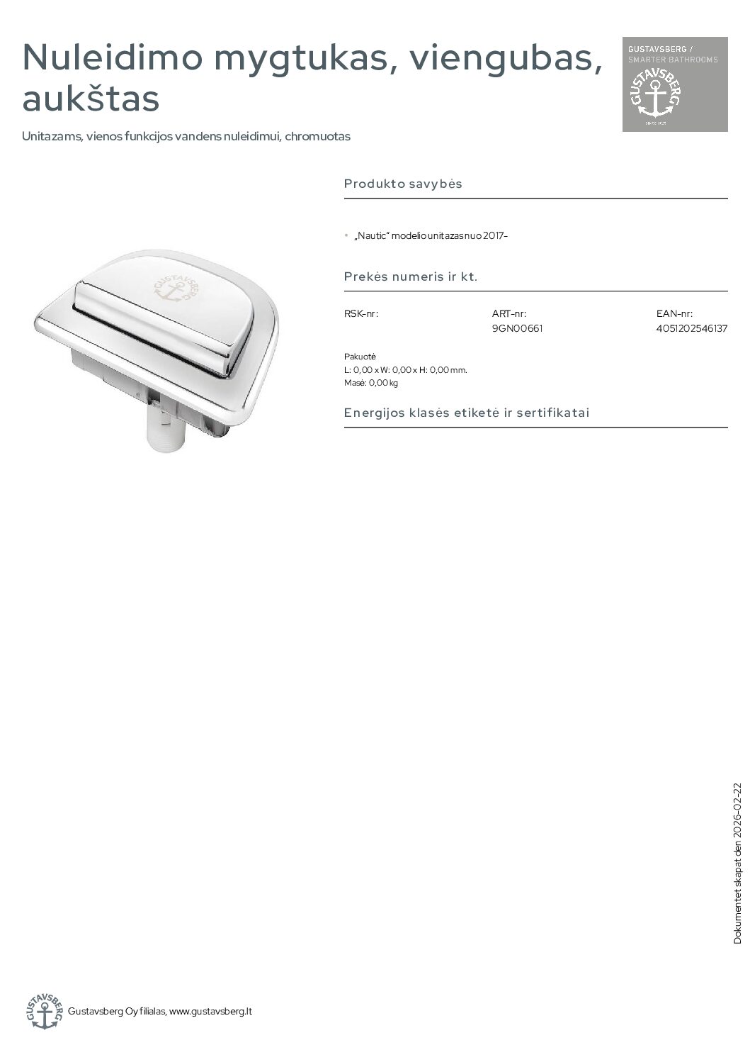 Gustavsberg nuleidimo mygtukas, viengubas, aukštas. Unitazams, vienos funkcijos vandens nuleidimui, chromuotas. „Nautic“ modelio unitazas nuo 2017-