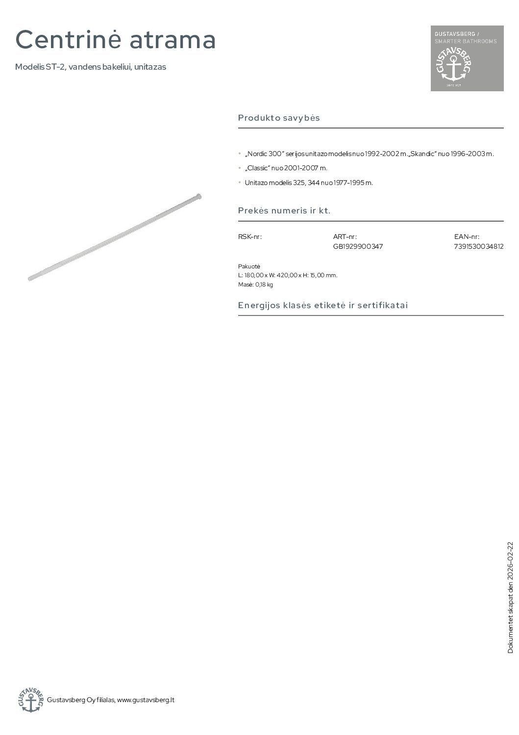 Gustavsberg Nordic 300 serija nuo 1992-2002 m. centrinė atrama. Modelis ST-2, vandens bakeliui, unitazas. „Nordic 300“ serijos unitazo modelis nuo 1992-2002 m.„Skandic“ nuo 1996-2003 m. „Classic“ nuo 2001-2007 m. Unitazo modelis 325, 344 nuo 1977-1995 m.