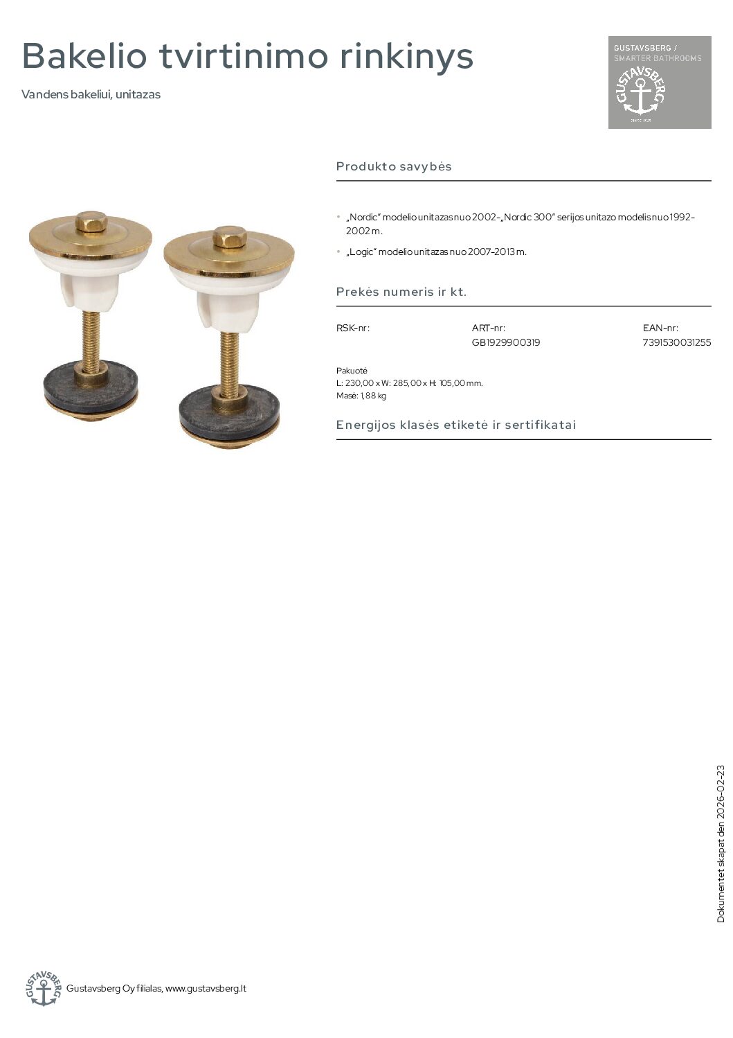 Gustavsberg Nordic nuo 2002- bakelio tvirtinimo rinkinys. Vandens bakeliui, unitazas. „Nordic“ modelio unitazas nuo 2002-„Nordic 300“ serijos unitazo modelis nuo 1992-2002 m. „Logic“ modelio unitazas nuo 2007-2013 m.