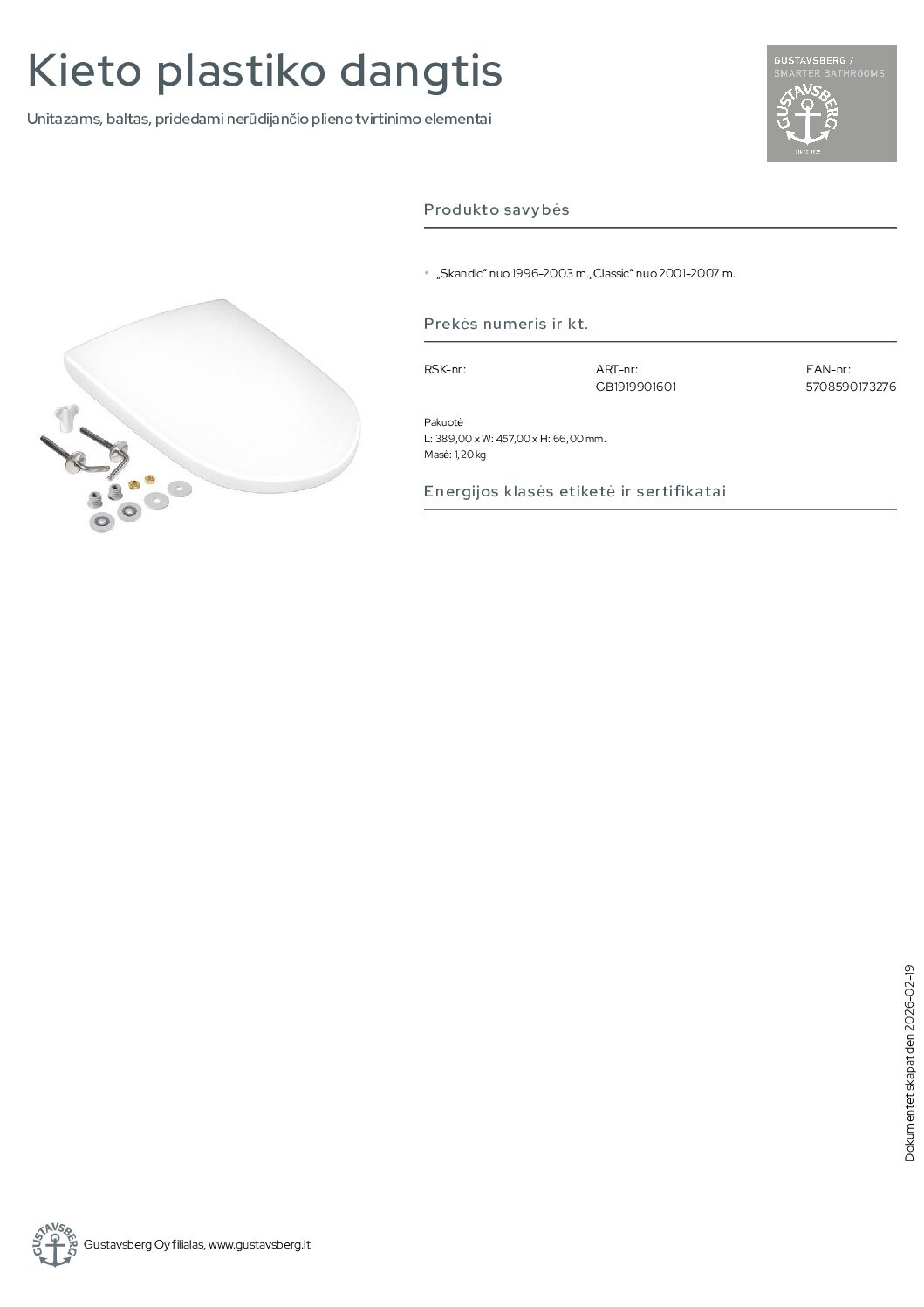 Gustavsberg Skandic WC Classic unitazo dangtis. Tinkamas visiems unitazams „Skandic“ nuo 1996-2003 m. „Classic“ nuo 2001-2007 m. Pagamintas iš aukštos kokybes kieto plastiko.