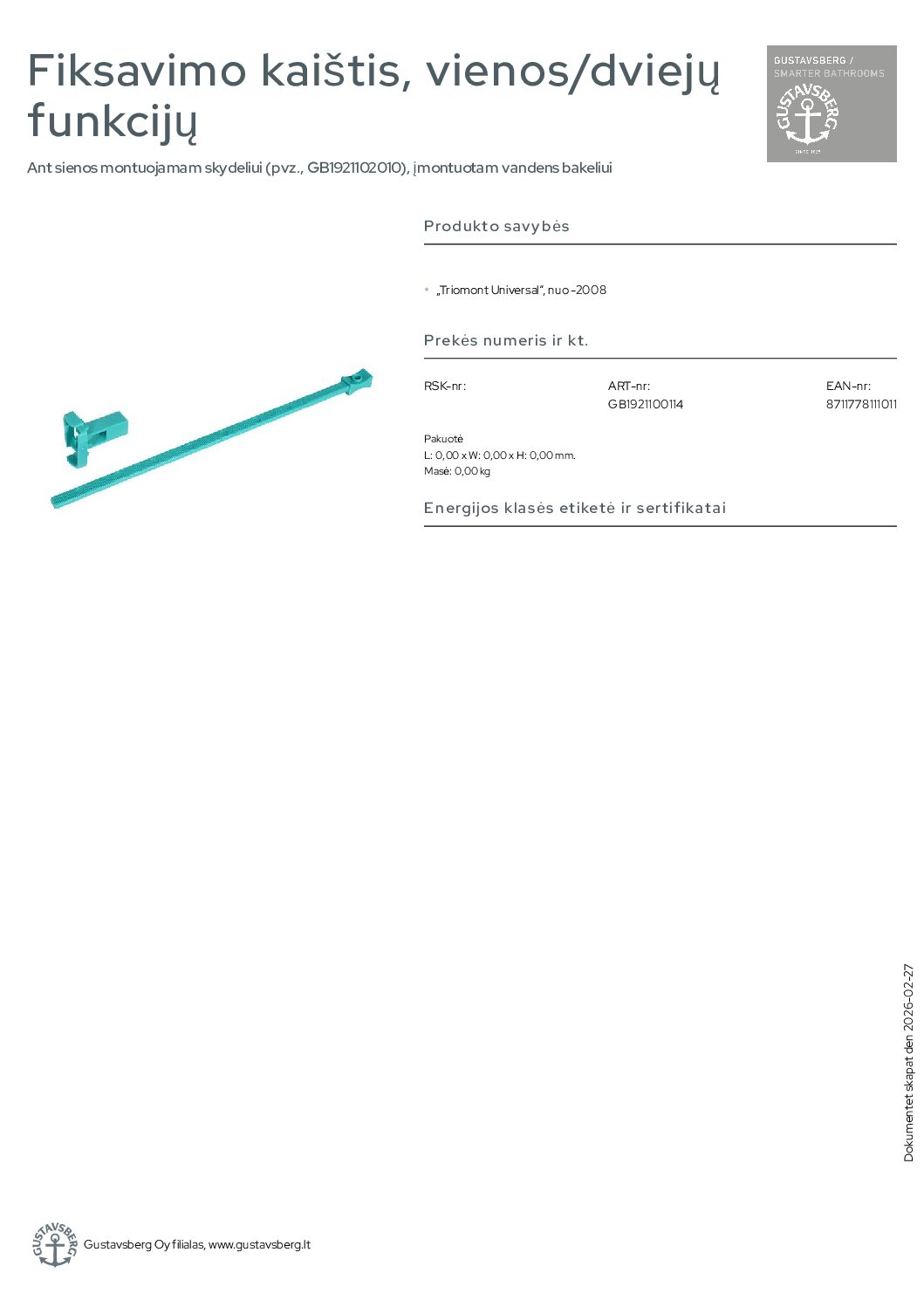 Gustavsberg Triomont Universal“, nuo -2008 fiksavimo kaištis, vienos/dviejų funkcijų. Ant sienos montuojamam skydeliui (pvz., GB1921102010), įmontuotam vandens bakeliui. „Triomont Universal“, nuo -2008