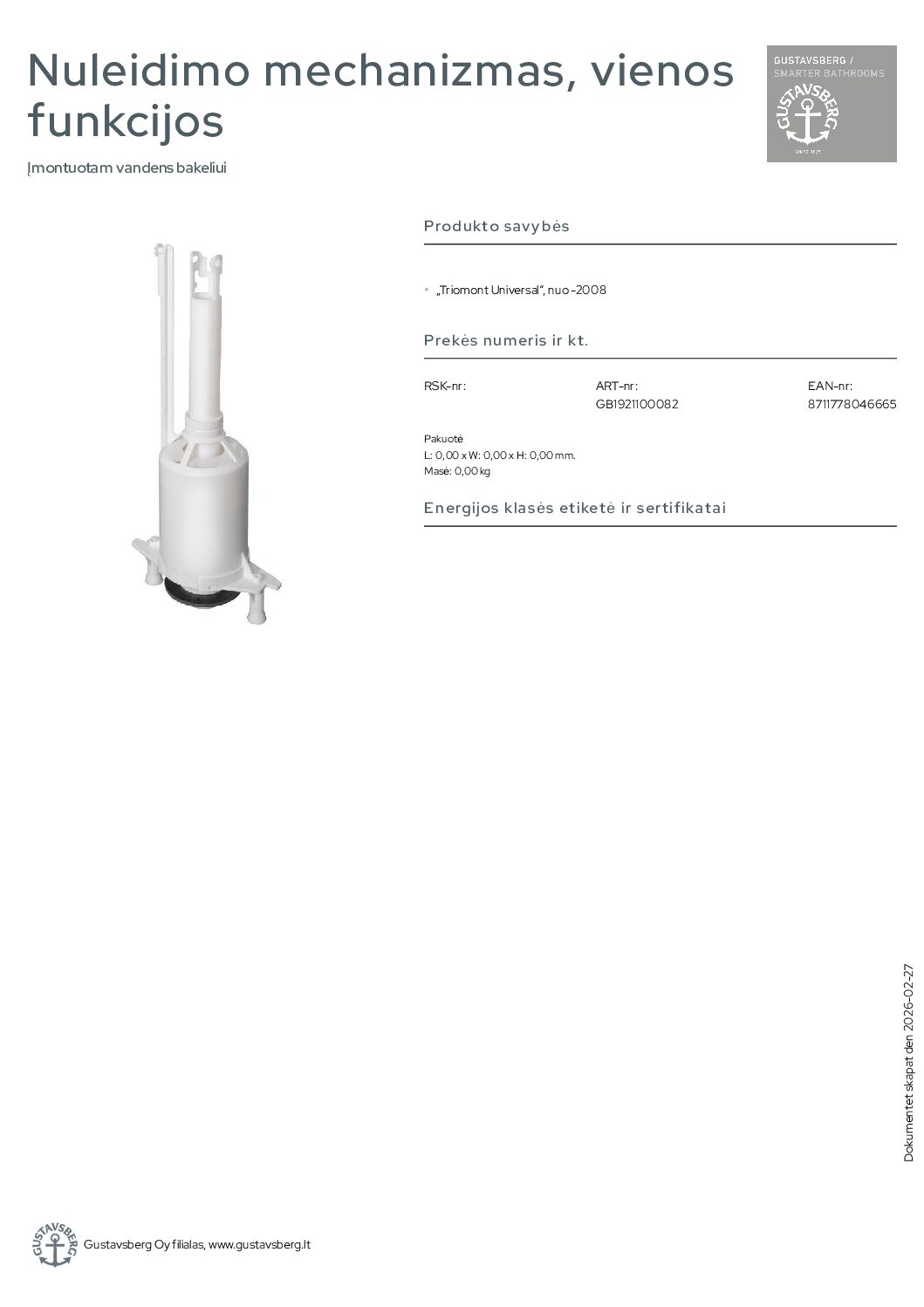 Gustavsberg Triomont Universal“, nuo -2008 nuleidimo mechanizmas, vienos funkcijos. Įmontuotam vandens bakeliui. „Triomont Universal“, nuo -2008