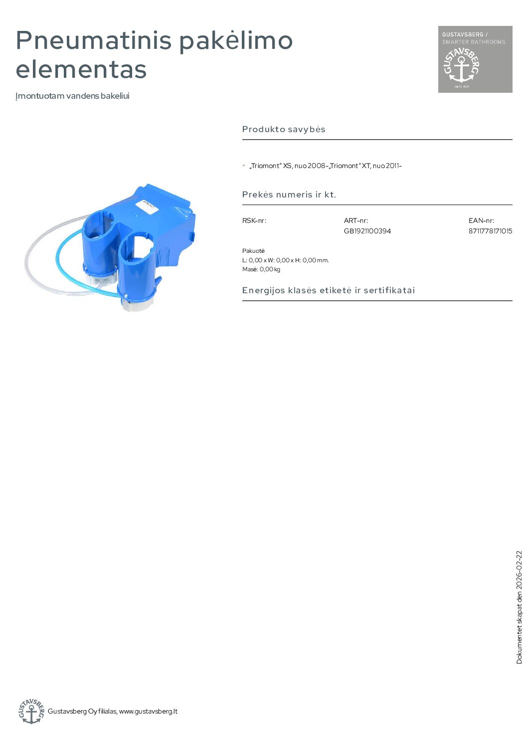 Gustavsberg Triomont XS, nuo 2008-pneumatinis pakėlimo elementas. Įmontuotam vandens bakeliui. „Triomont“ XS, nuo 2008-„Triomont“ XT, nuo 2011-