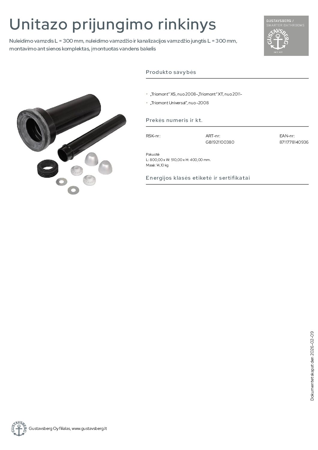 Gustavsberg Triomont XS, nuo 2008-unitazo prijungimo rinkinys. Nuleidimo vamzdis L = 300 mm, nuleidimo vamzdžio ir kanalizacijos vamzdžio jungtis L = 300 mm, montavimo ant sienos komplektas, įmontuotas vandens bakelis. „Triomont“ XS, nuo 2008-„Triomont“ XT, nuo 2011- „Triomont Universal“, nuo -2008