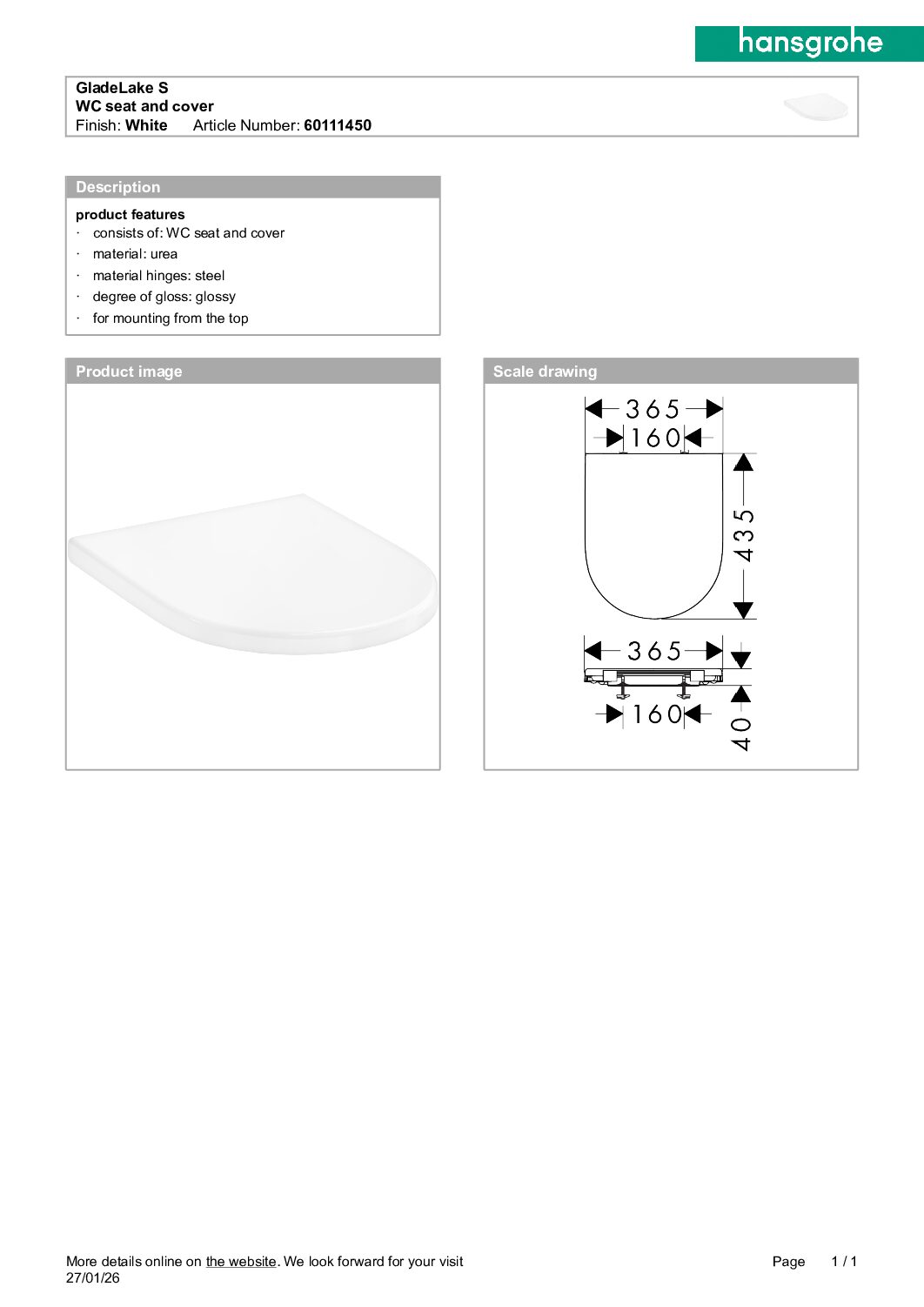 Hansgrohe GladeLake S, dangtis. Medžiaga karbamidas, vyrių medžiaga plienas.