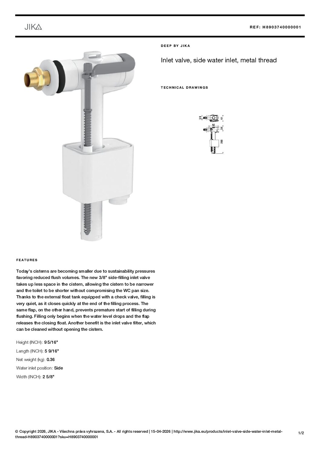 JIKA šoninio pripildymo mechanizmas, metalinis sriegis. Šiandieniniai bakeliai tampa vis mažesni dėl tvarumo spaudimo, kuris skatina mažinti nuleidimo kiekius. Naujasis 3/8 colio šoninio užpildymo įleidimo vožtuvas užima mažiau vietos bakelyje, todėl bakelis gali būti siauresnis, o unitazas – trumpesnis, nepakenkiant unitazo puodo dydžiui. Dėl išorinio plūdės bakelio su atbuliniu vožtuvu pildymas yra labai tylus, nes jis greitai užsidaro pasibaigus pildymo procesui. Kita vertus, tas pats atvartas neleidžia per anksti pradėti pildyti nuleidimo metu. Pildymas prasideda tik tada, kai vandens lygis nukrenta, o atvartas atleidžia uždaromą plūdę. Kitas privalumas yra įleidimo vožtuvo filtras, kurį galima valyti neatidarant bakelio.