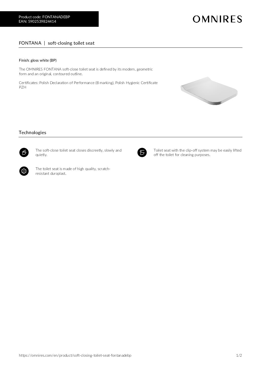 Omnires FONTANA minkšto uždarymo klozeto dangtis išsiskiria lengvu dizainu, subtilia, tikslia linija. Aukštos kokybės pagamintas iš Duroplasto. Švelnus dangčio išlinkis diskretiškai paslepia jo tvirtinimo elementus.