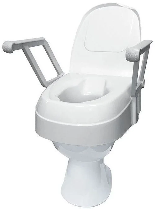 Paaukštinta tualeto sėdynė su porankiais, TSE 120. Ergonomiškos formos, itin tvirtas paaukštinimas su atlenkiamais porankiais užtikrina komfortišką sėdėjimo padėtį ir naudojimą. Paaukštinta tualeto sėdynė naudojama kai sunku atsisėsti/atsikelti nuo tualeto. Su pakeliamu dangčiu; Dvi higieniškos išpjovos ir integruota sėdynė; Pagaminta iš tvirto, smūgiams atsparaus plastiko; Su apsauga nuo vandens taškymosi; Su šonine apsauga nuo slydimo; Išlenkimas ant dangčio palengvina jo atidarymą; Atlenkiami, neslystantys porankiai; Paprastas surinkimas be įrankių; Trijų padėčių aukščio reguliavimas – 8,5; 12 ir 15,5 cm; Lygūs paviršiai palengvina valymą.